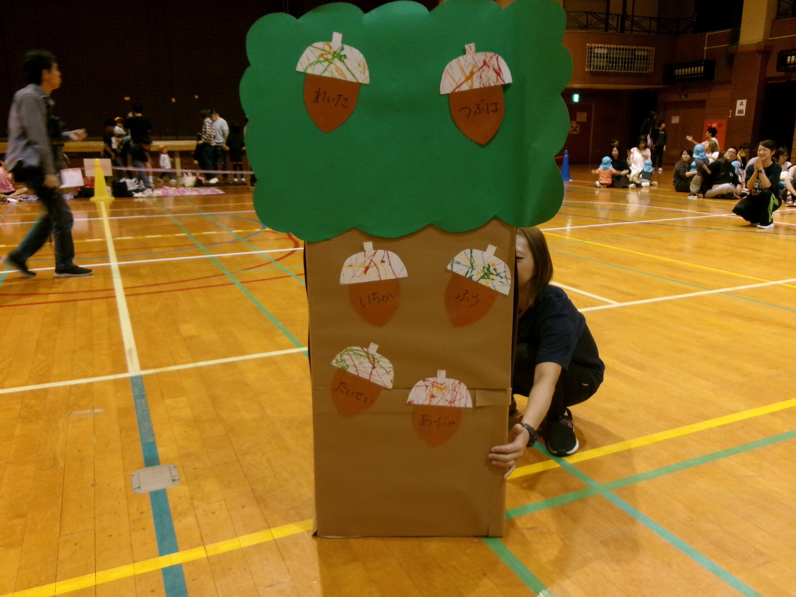 いちご組親子競技:どんぐりは子どもたちがビー玉を使って作りました。パパ・ママと協力して自分のどんぐりを見つけてメダルと交換!