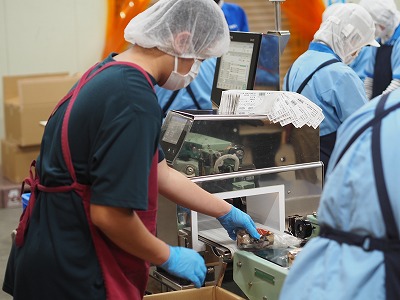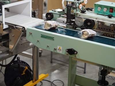 詰め終えた袋は計量してベルトコンベアで次の工程へと運びます。