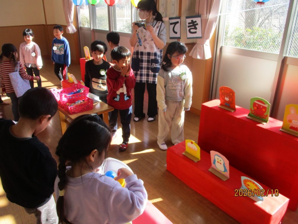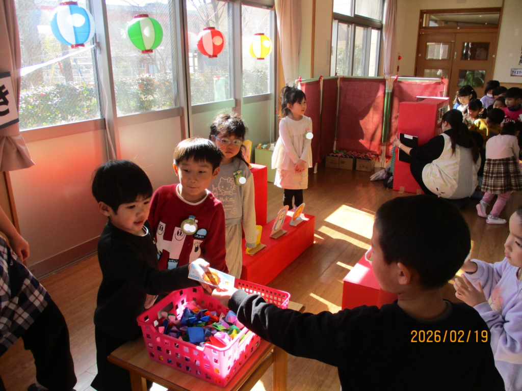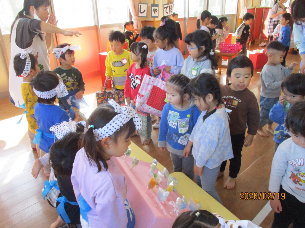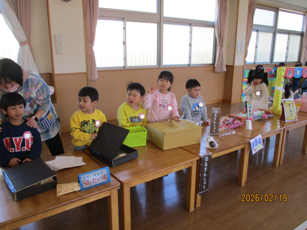 2月19日にお店屋さんごっこがありました。今年は「温泉街」をテーマに、ぱんだ組・きりん組・らいおん組が準備してくれました!