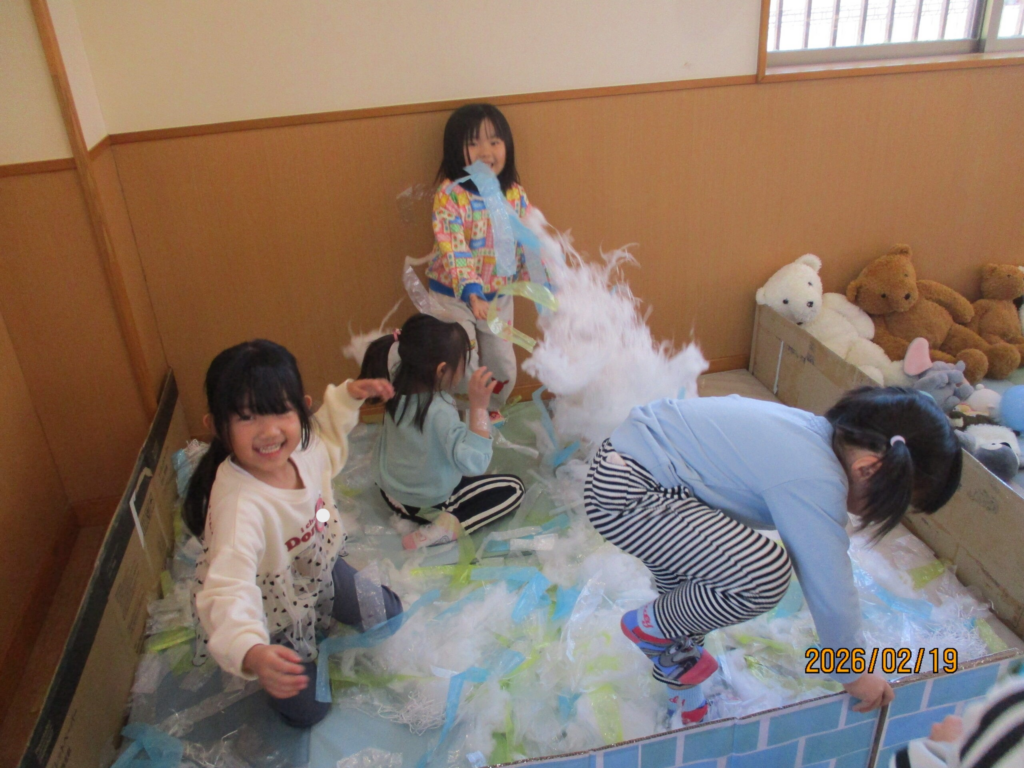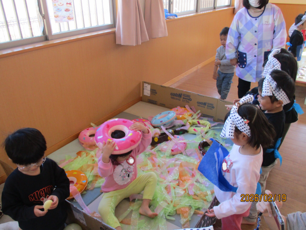 ぱんだ組は、「あわあわのお風呂」「動物のお風呂」「ドーナツのお風呂」を用意しました♪楽しそうに遊ぶ子どもたちでした!