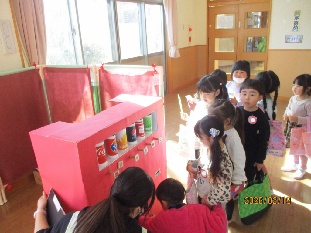 らいおん組は、射的と自動販売機を用意しました♪射的は、的を狙ってカラーボールを投げて楽しみました。本物のような自動販売機は行列ができるほどの大人気でした!