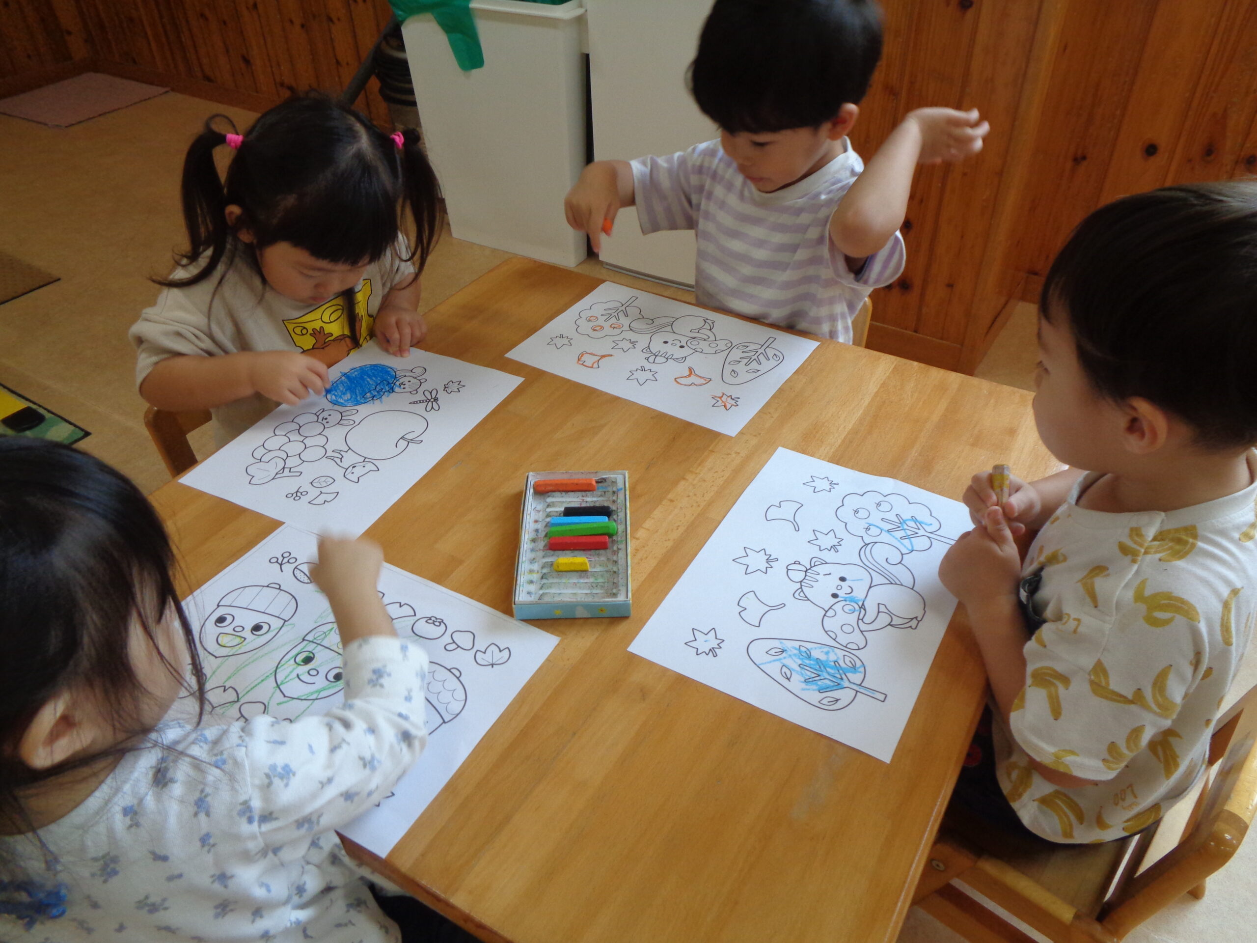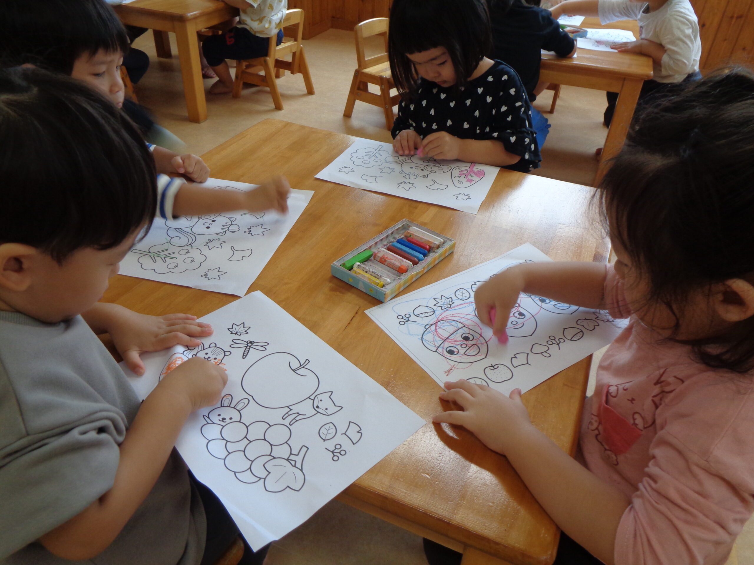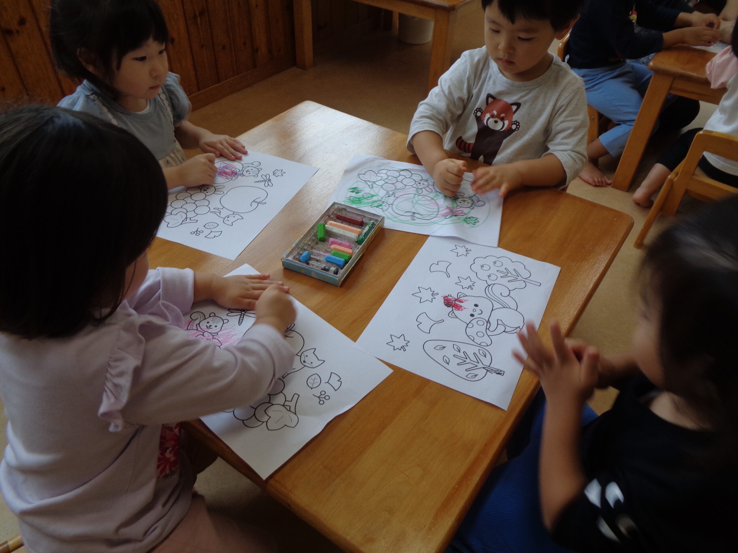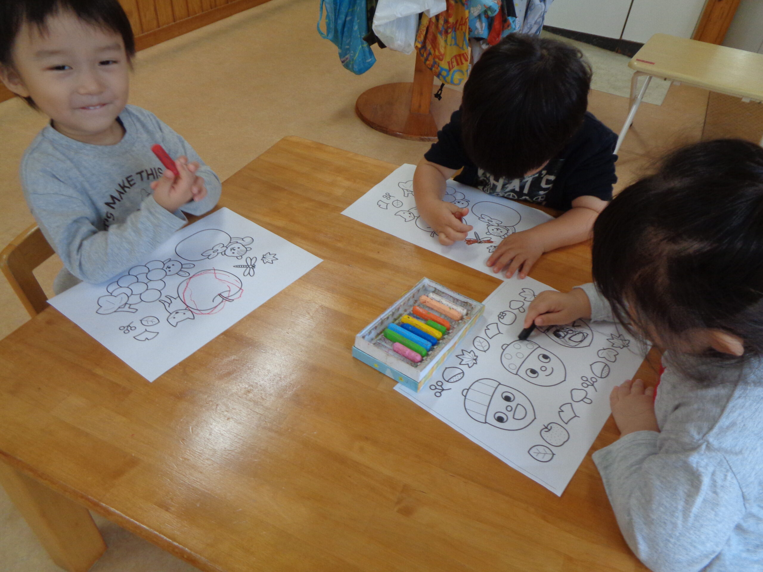 ○秋のイラストの塗り絵を楽しみました。中を塗るのが上手になってきました。