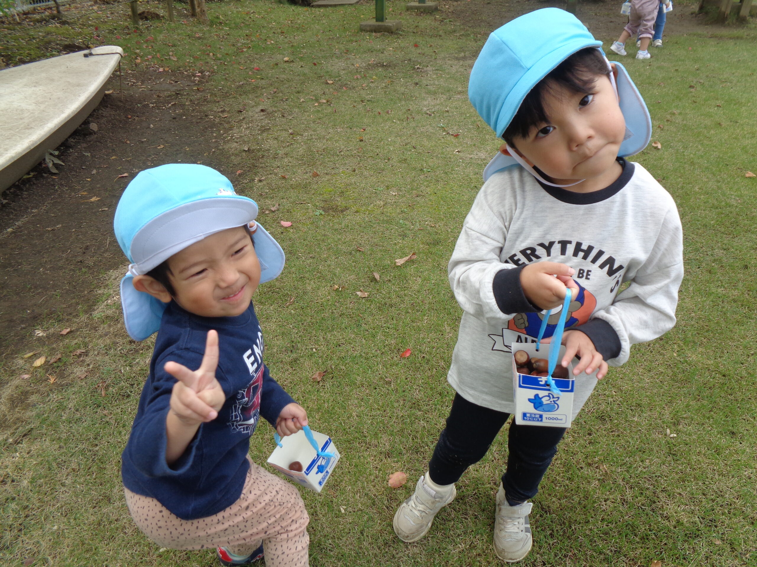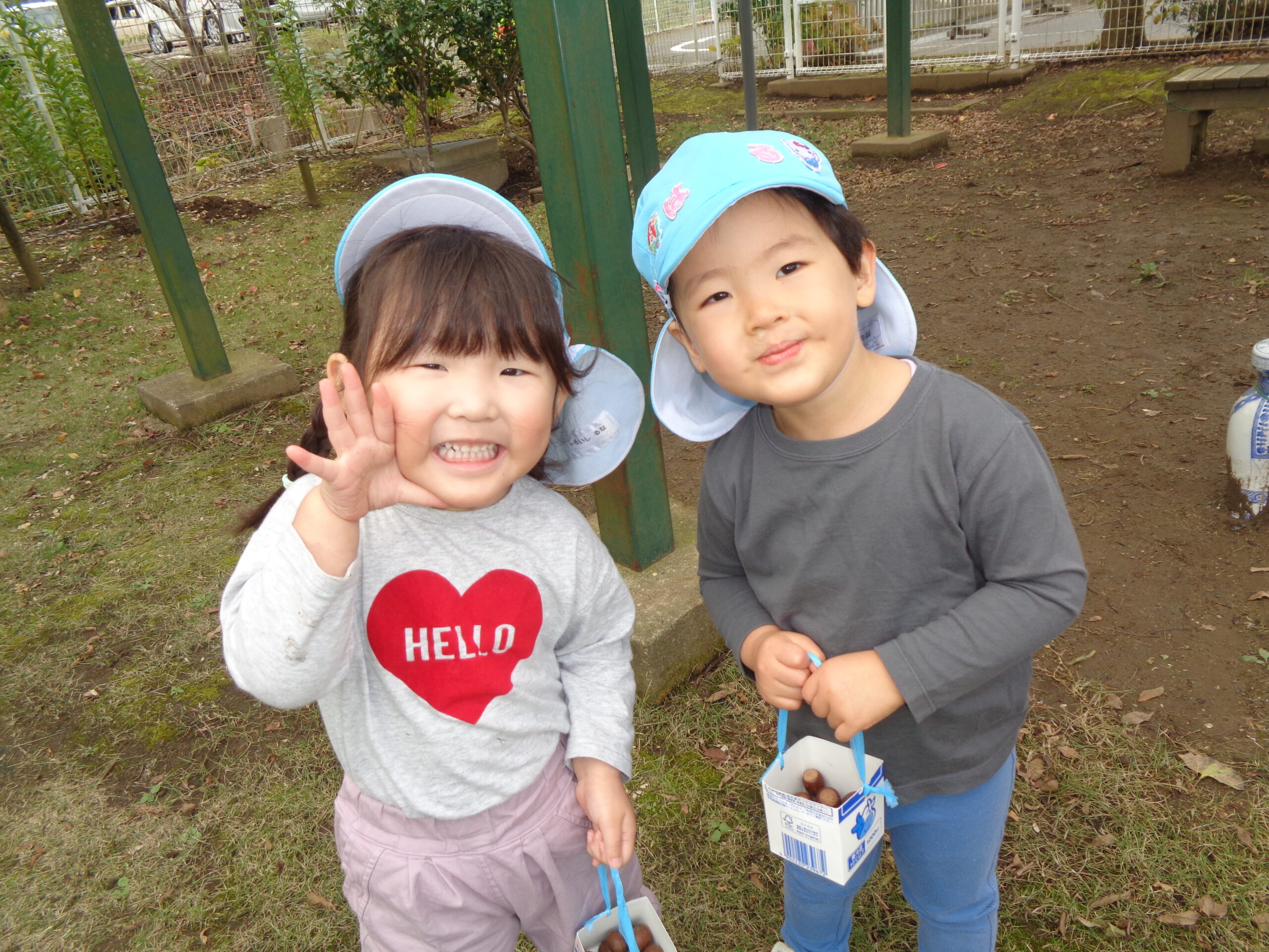 ○青空保育園の園庭にはたくさんどんぐりが落ちています。いっぱい拾ったよ!