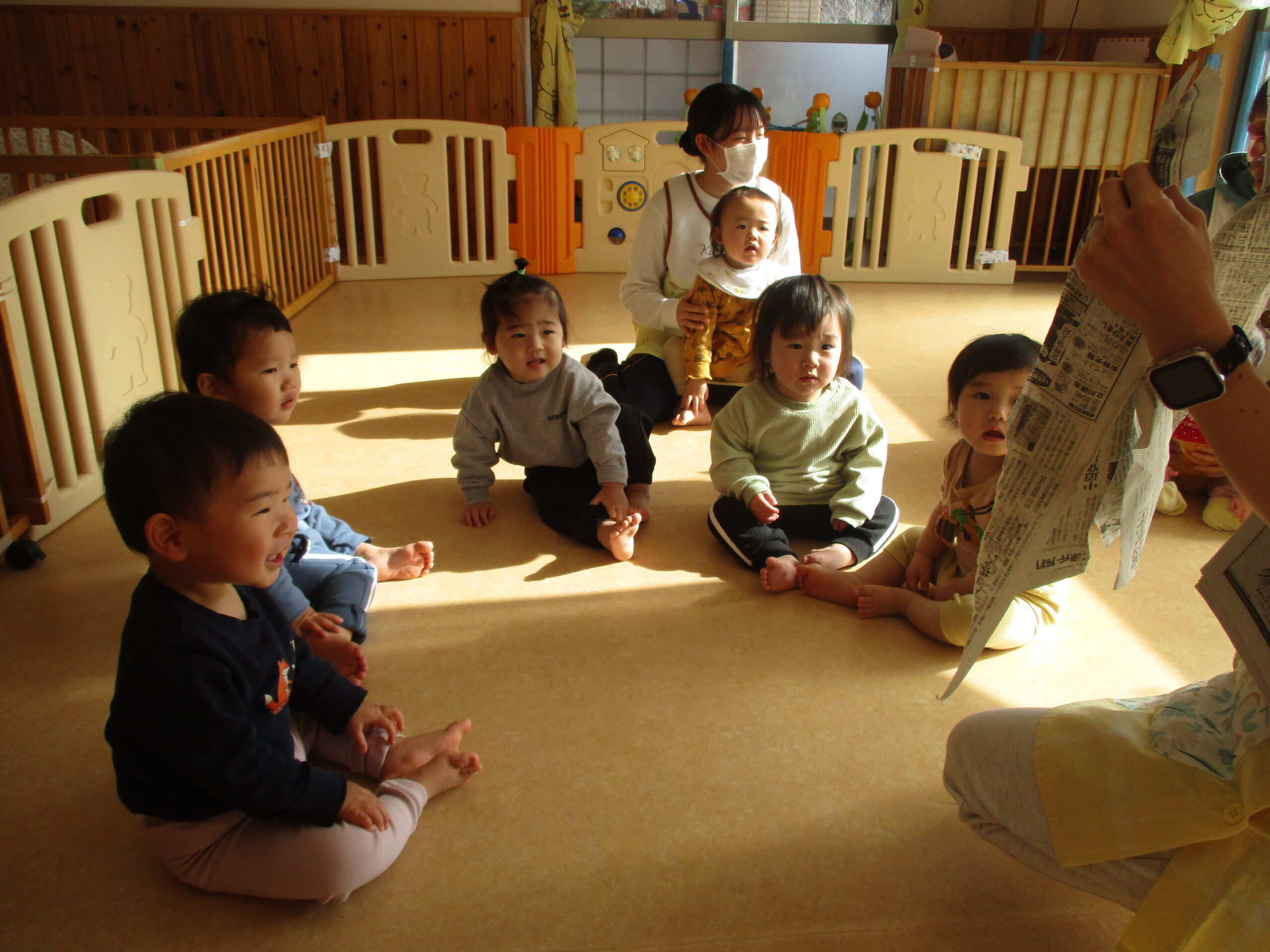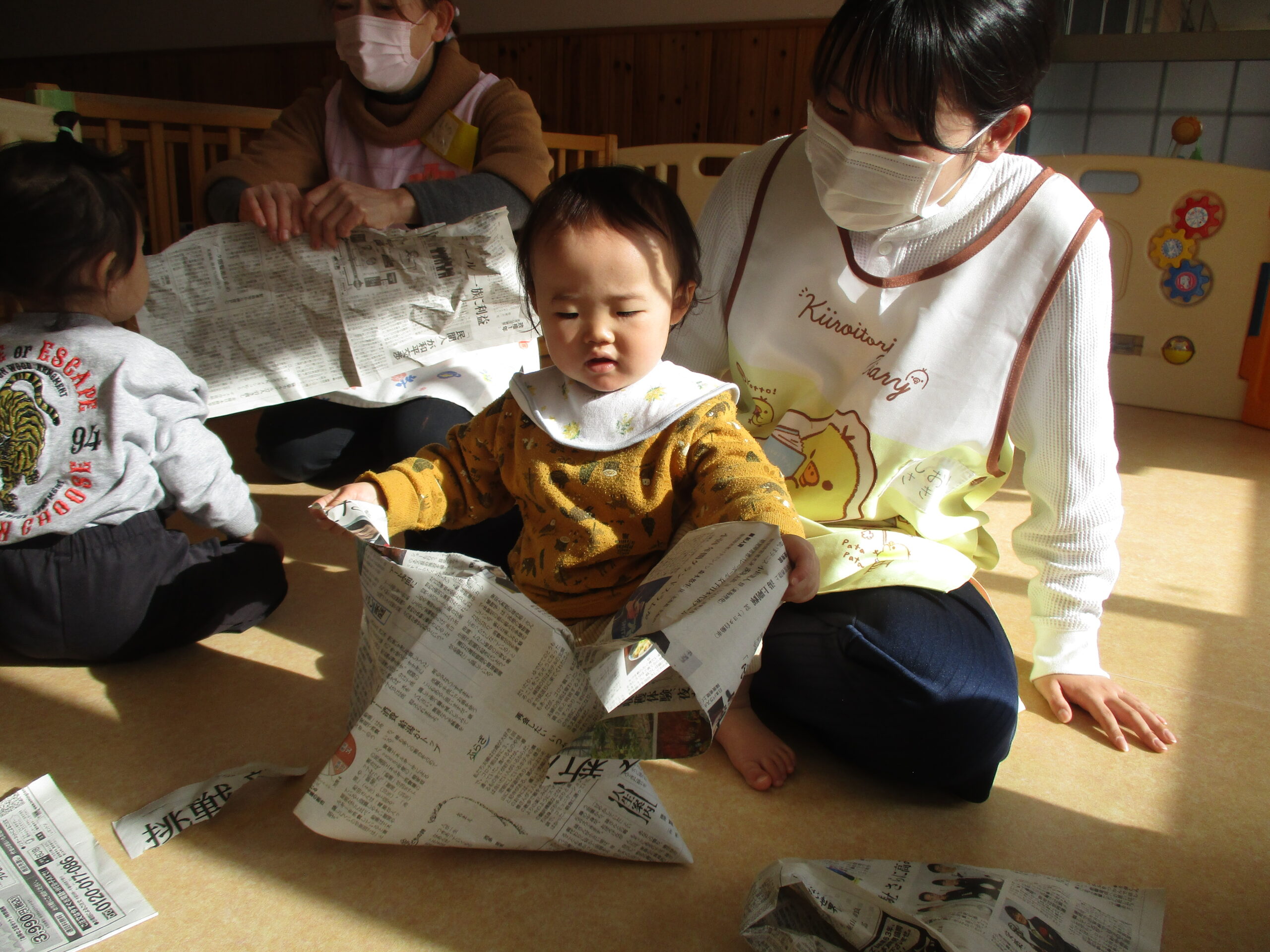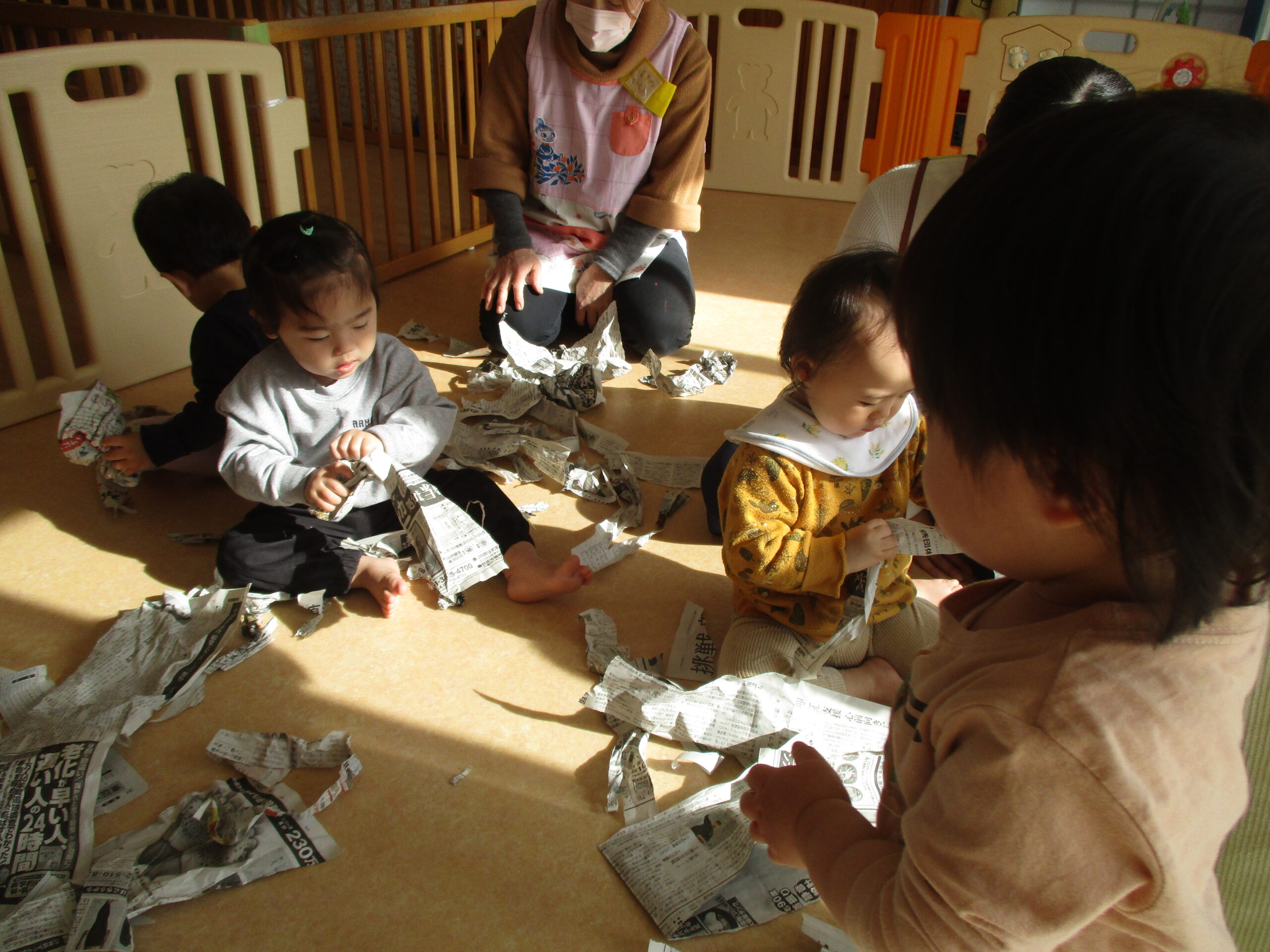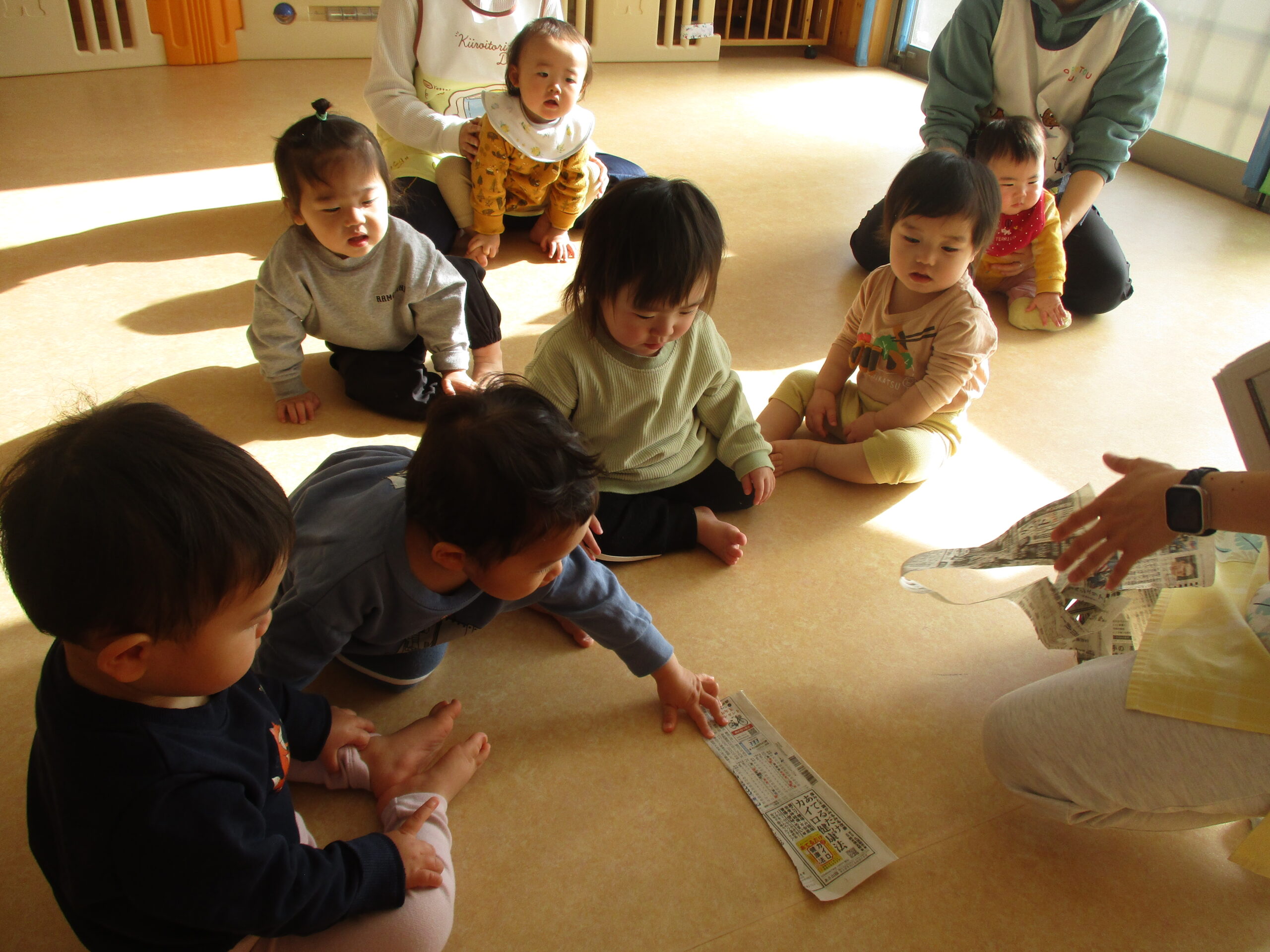 はじめて新聞紙遊びをしました。「こうやってやるんだよ」とお手本を見せてくれた先生のことを興味津々に見ていました子どもたちです。一緒にビリビリという感触を楽しみながらたくさん破き、頭の上に投げてヒラヒラと降らせたり埋もれたりして大はしゃぎしていました。