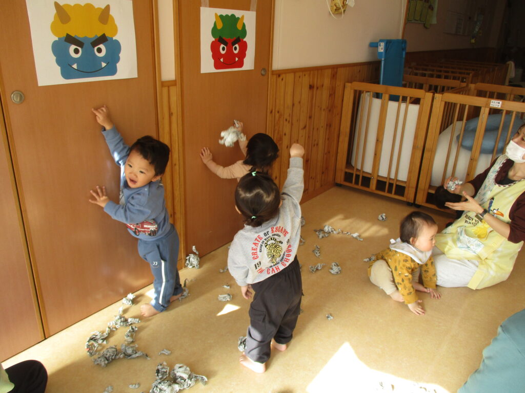 新聞紙遊びの最後はボールを作って豆まきの練習。鬼に向かって一生懸命投げていました。