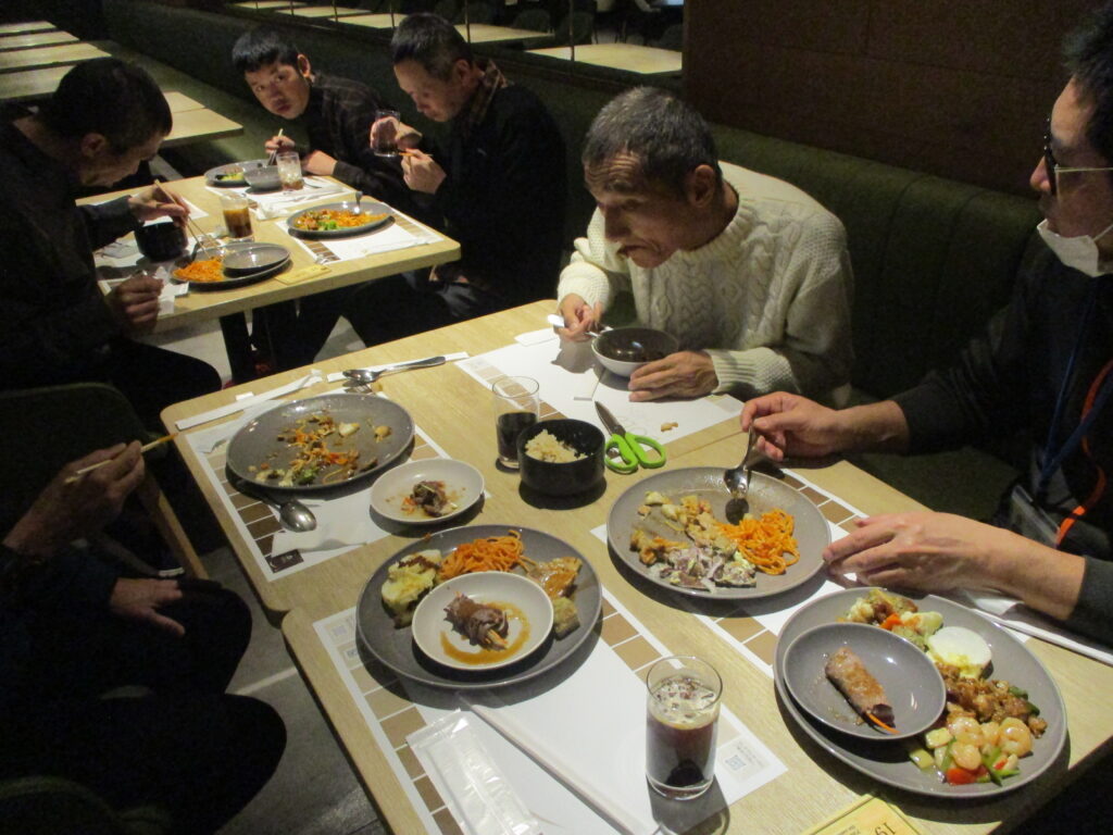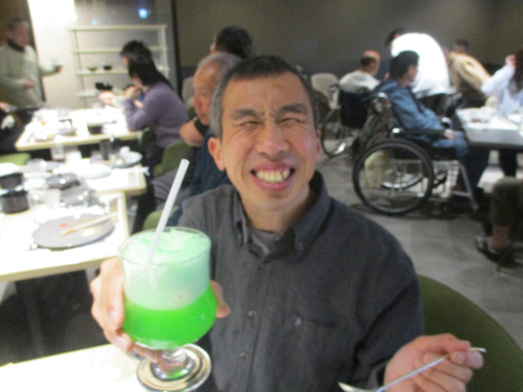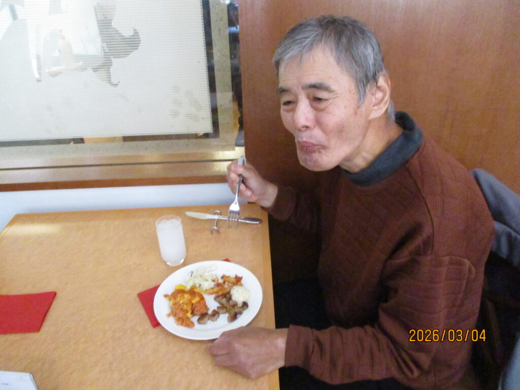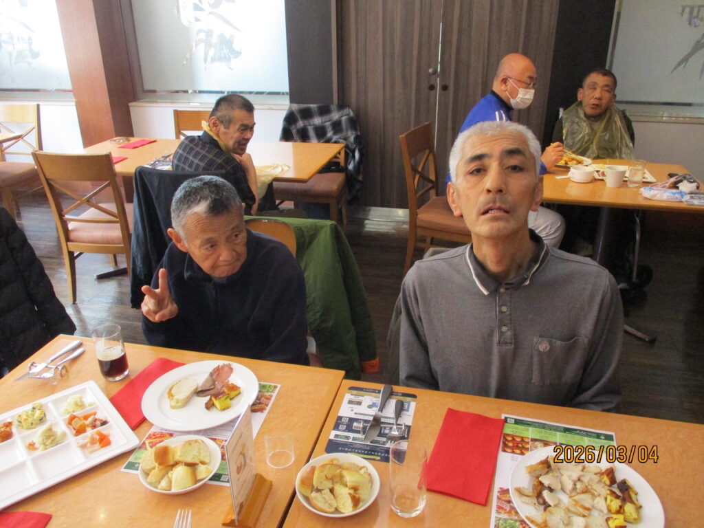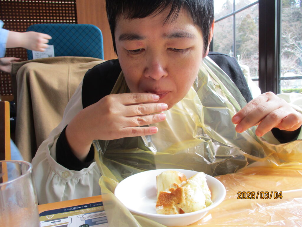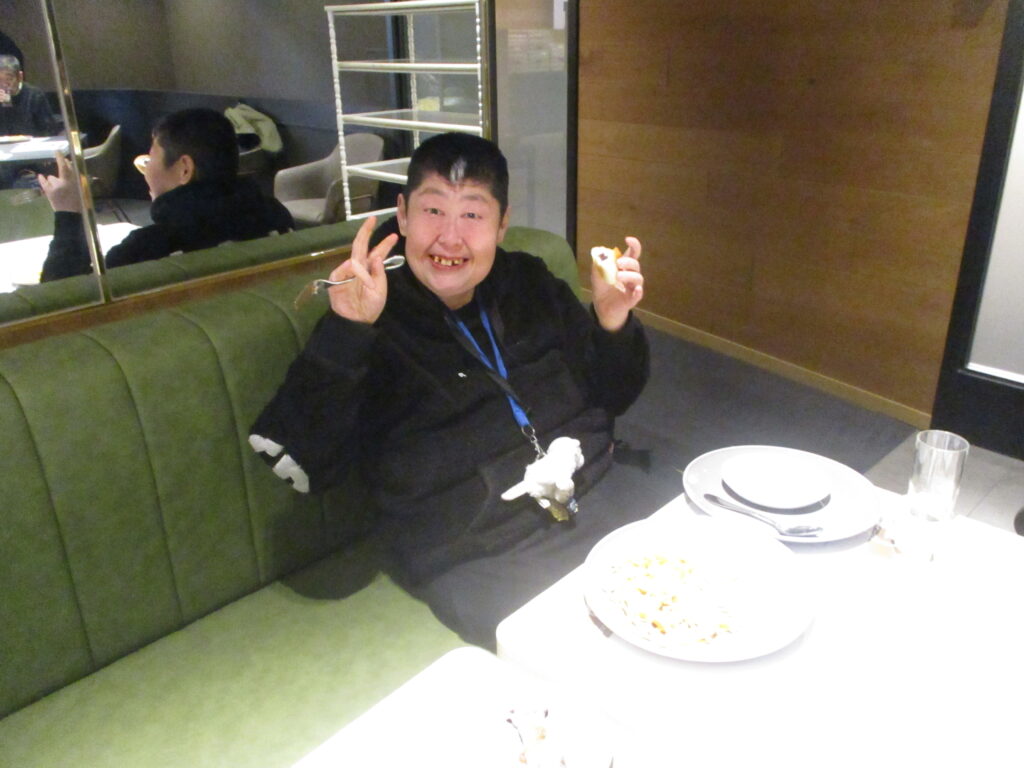 ホテルに到着し、職員が介助をしながら食事を楽しみました。普段は中々食べる機会の無い食べ物もあって嬉しそうでした👏
