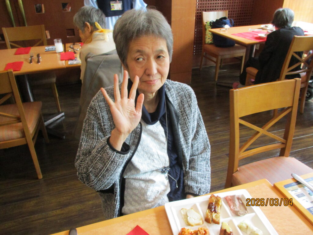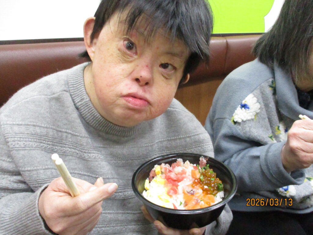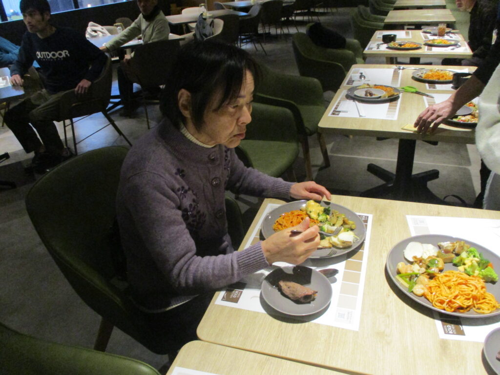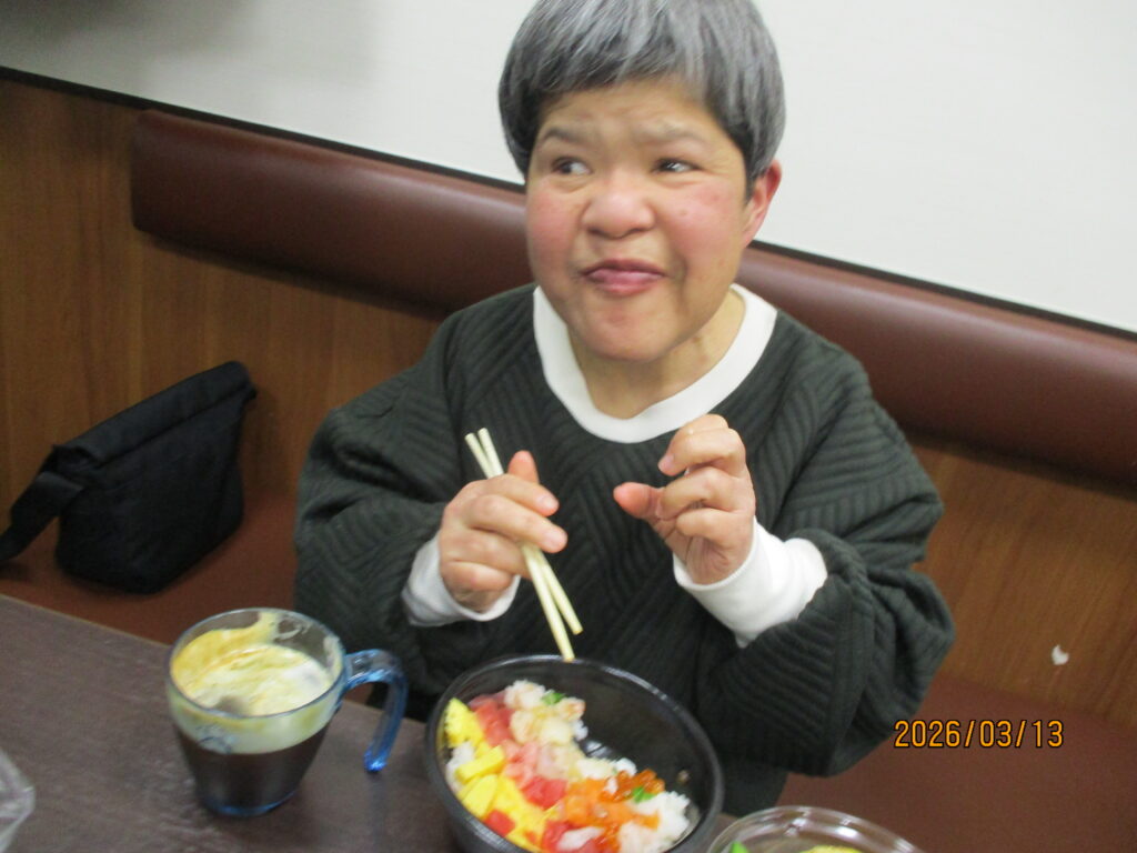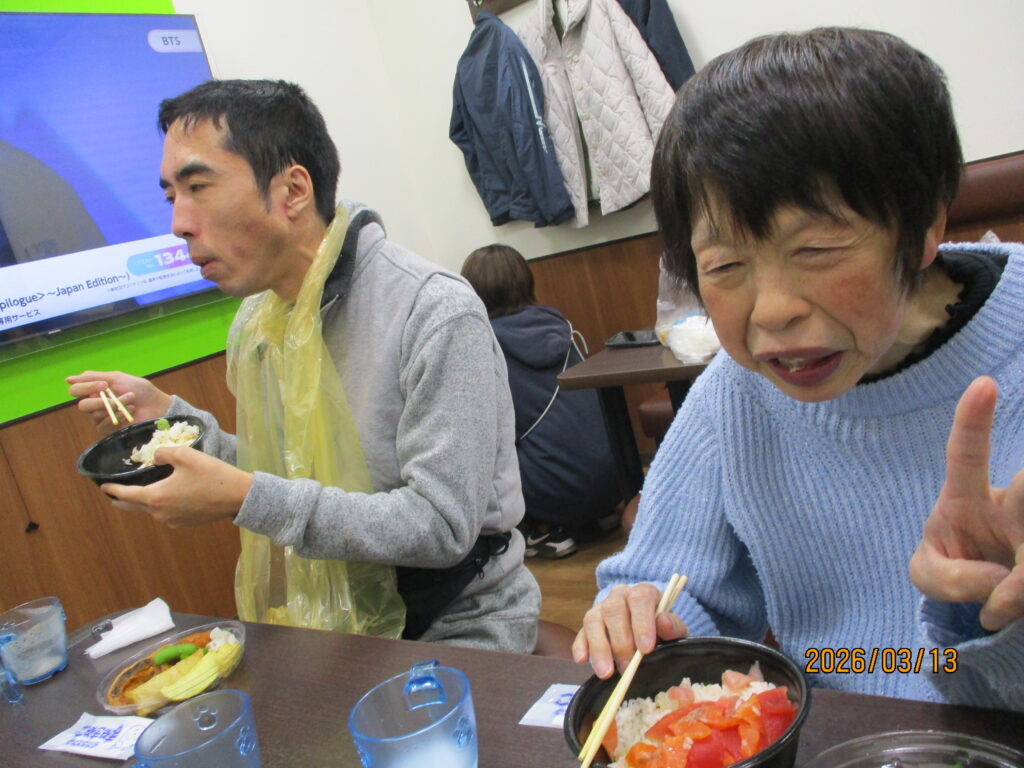 ホテルに到着し、職員が介助をしながら食事を楽しみました。普段は中々食べる機会の無い食べ物もあって嬉しそうでした👏