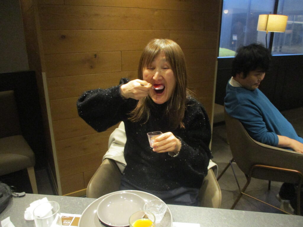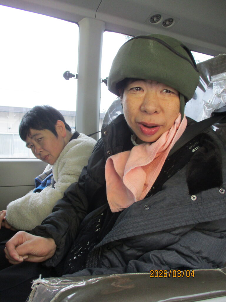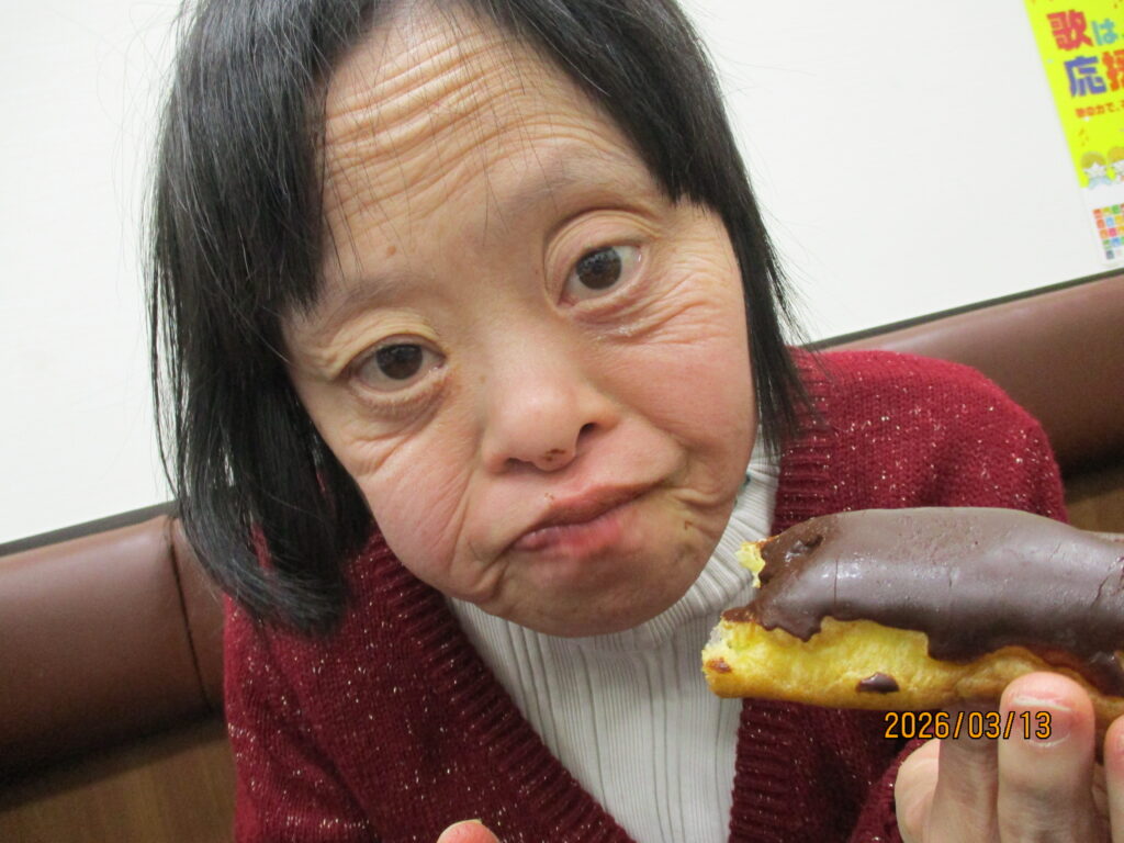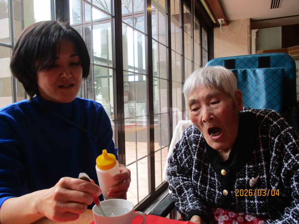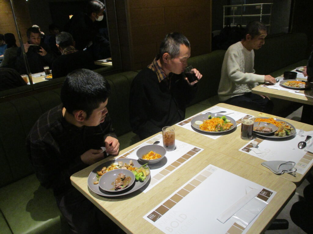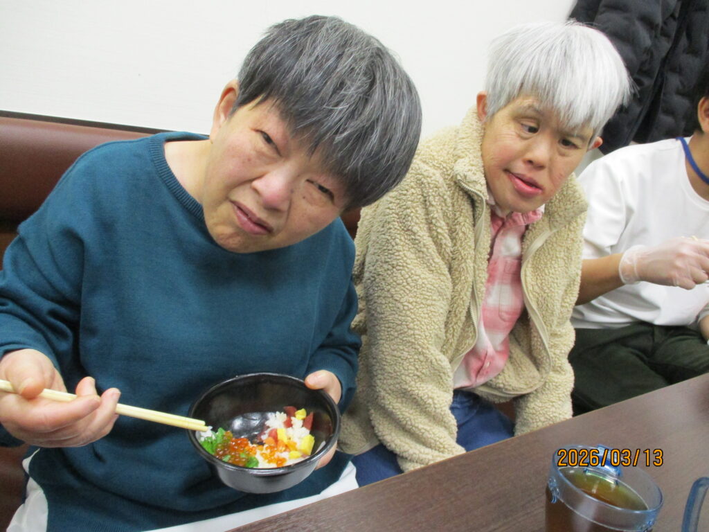 ホテルに到着し、職員が介助をしながら食事を楽しみました。普段は中々食べる機会の無い食べ物もあって嬉しそうでした👏