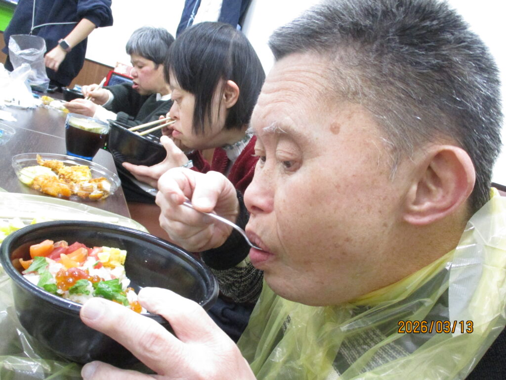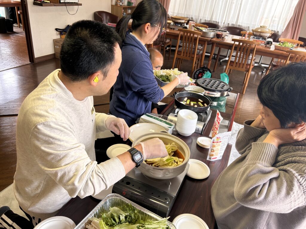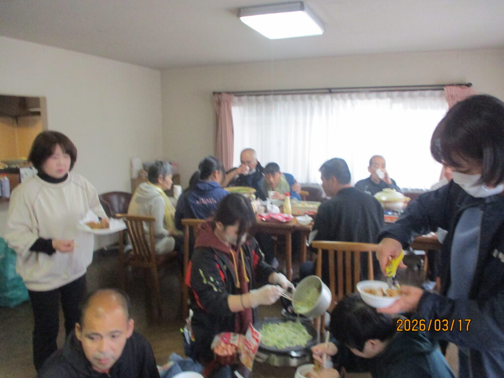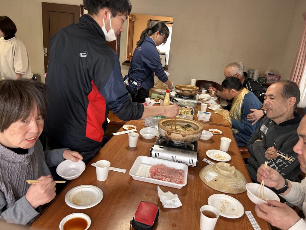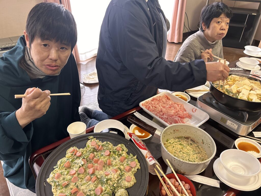 園に帰った後は職員と利用者さんが協力してしゃぶしゃぶ、たこ焼き、唐揚げ、手巻き寿司を作りました🍳結果は大成功!和気あいあいと楽しい昼食でした😊